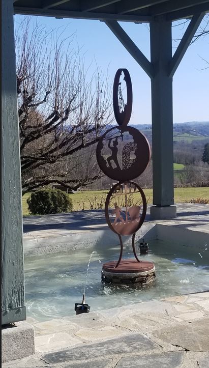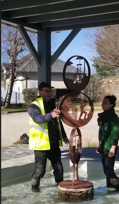 En visite dans la commune, Mr Demai, sous-préfet du Cantal a assisté à la mise en place de la sculpture en métal dans le bassin de la fontaine du parking.